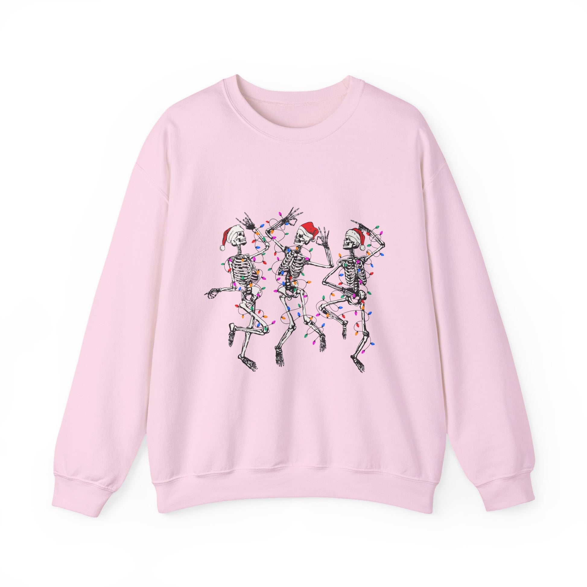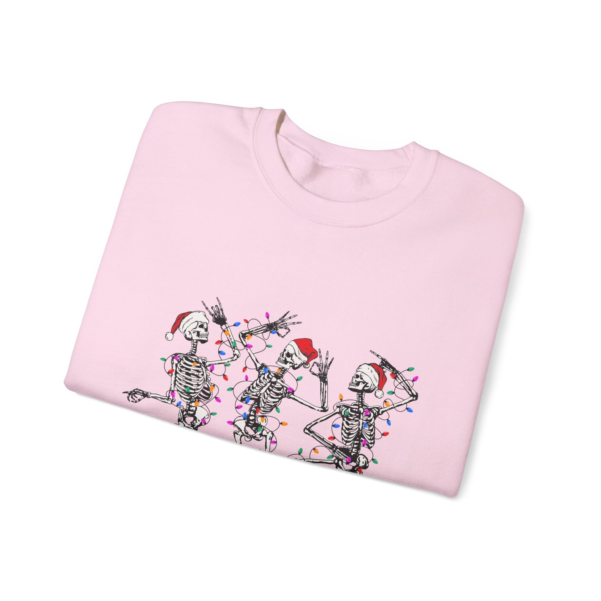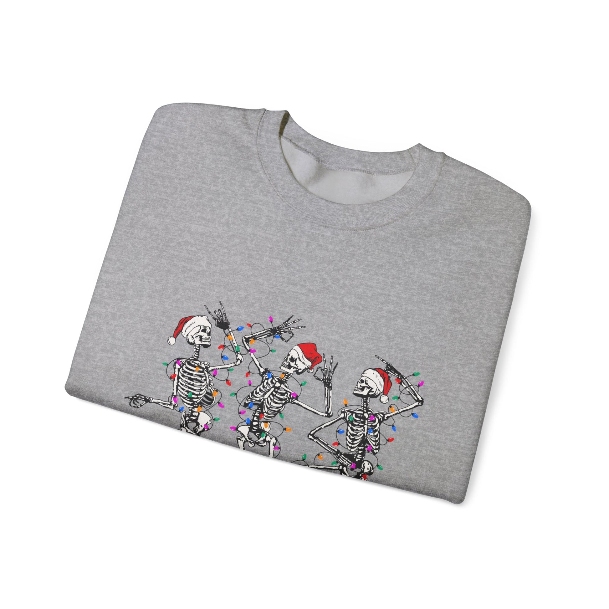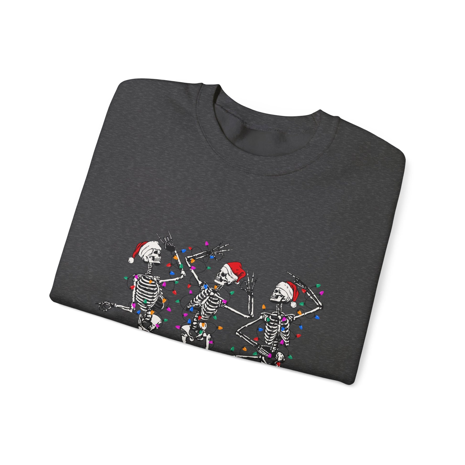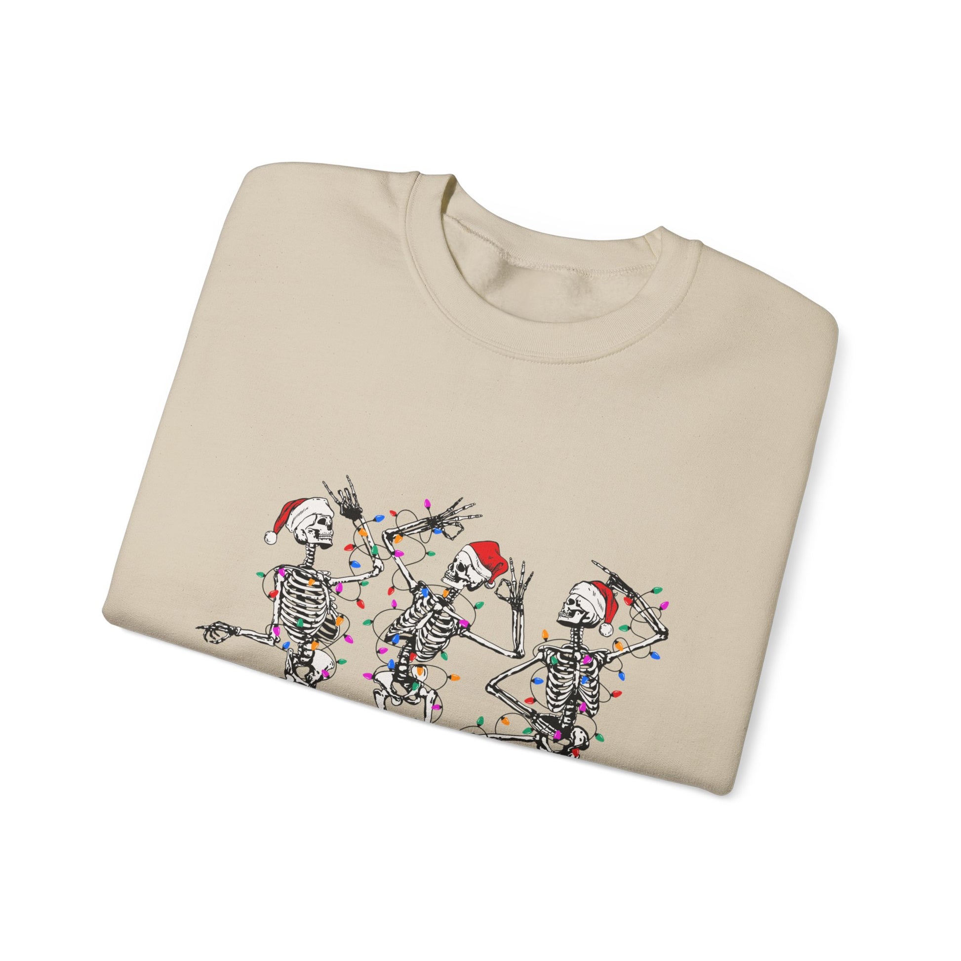 A cozy, lived-in crewneck that carries a touch of dark humor and seasonal cheer. Soft, medium-weight fabric and a relaxed classic fit make this sweatshirt feel like an instant favorite. The front shows three playful skeletons mid-dance, each adorned with tiny holiday lights and a Santa hat — a subtle blend of spooky and festive that works whether you’re layering for a chilly night walk or lounging with friends by string lights. The tubular knit construction gives smooth side seams and a clean silhouette, while ribbed collar and reinforced stitching keep the shape wash after wash. Wear it when you want something warm, a little irreverent, and quietly expressive of your offbeat holiday spirit.