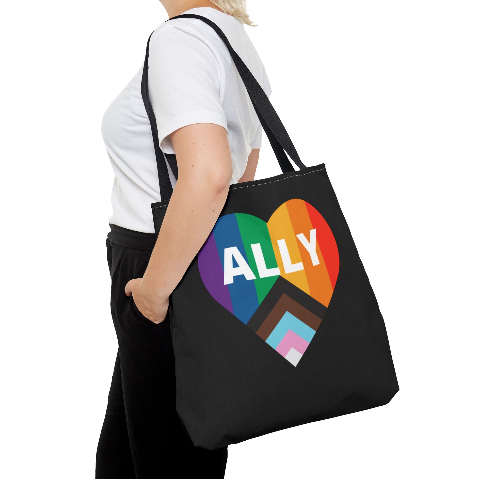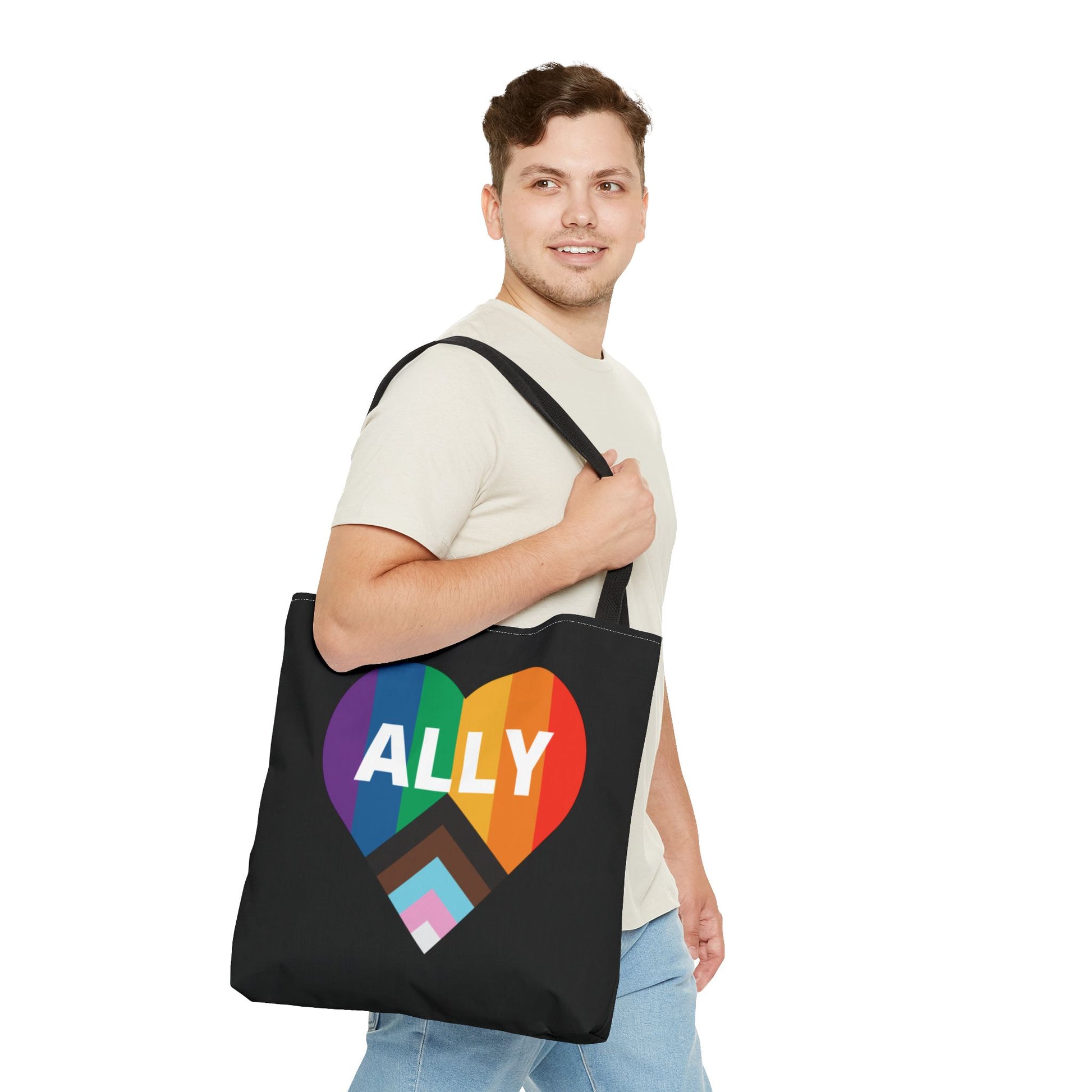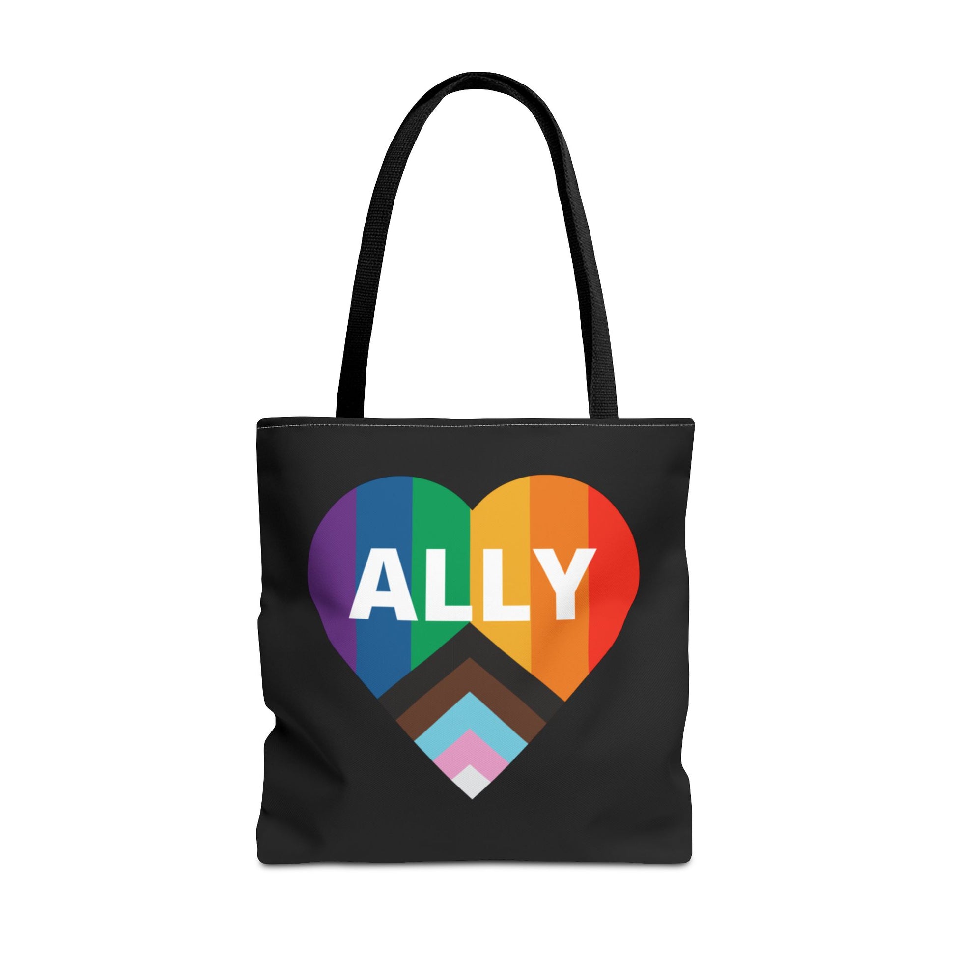 Introducing our vibrant Tote Bag, a perfect blend of style and function that elevates any outfit. This eye-catching accessory features a heart design with the word 'ALLY' prominently displayed, symbolizing inclusivity and love. The bag creates a welcoming atmosphere, ideal for daily use or special events. It fits seamlessly into your life, whether you're heading to the beach, running errands, or attending a festival. Designed for anyone who values self-expression and community, this Tote Bag makes a thoughtful gift for friends or family celebrating Pride Month, birthdays, or everyday achievements!