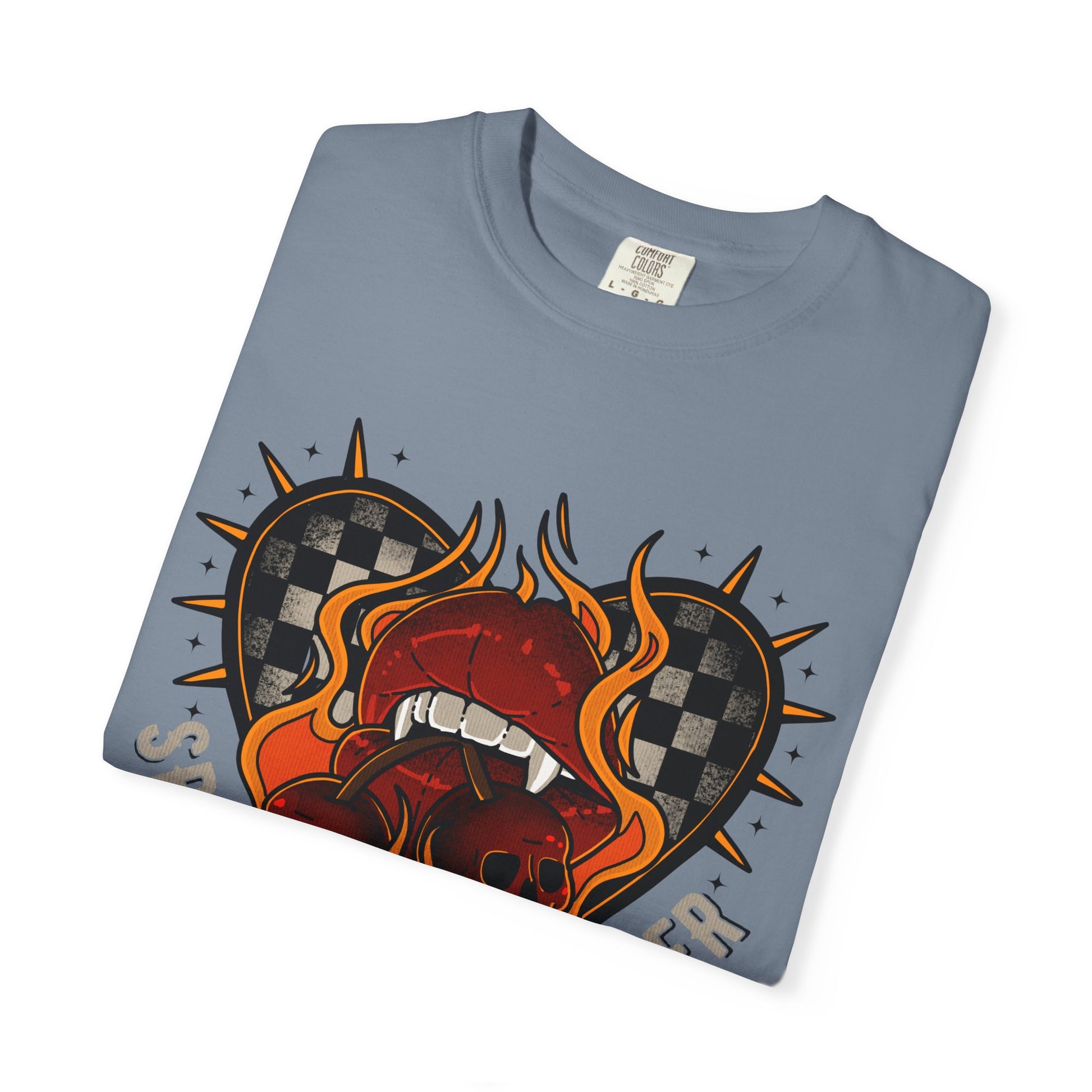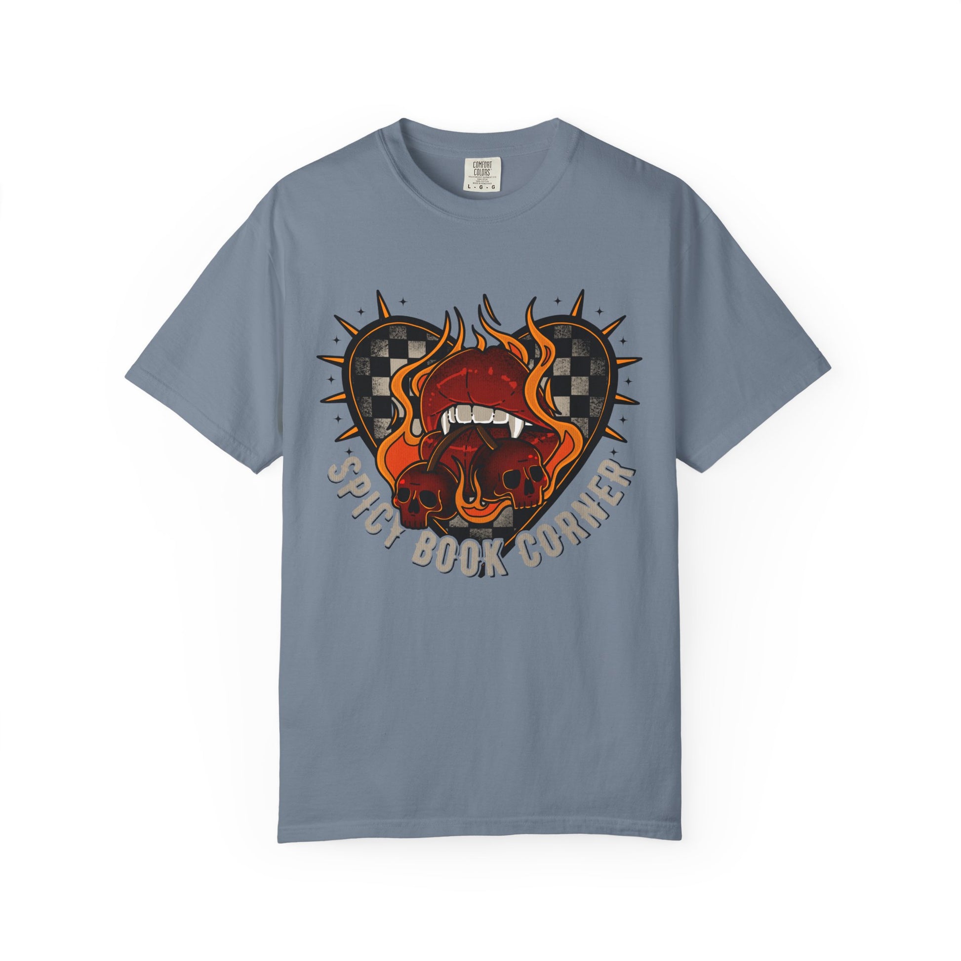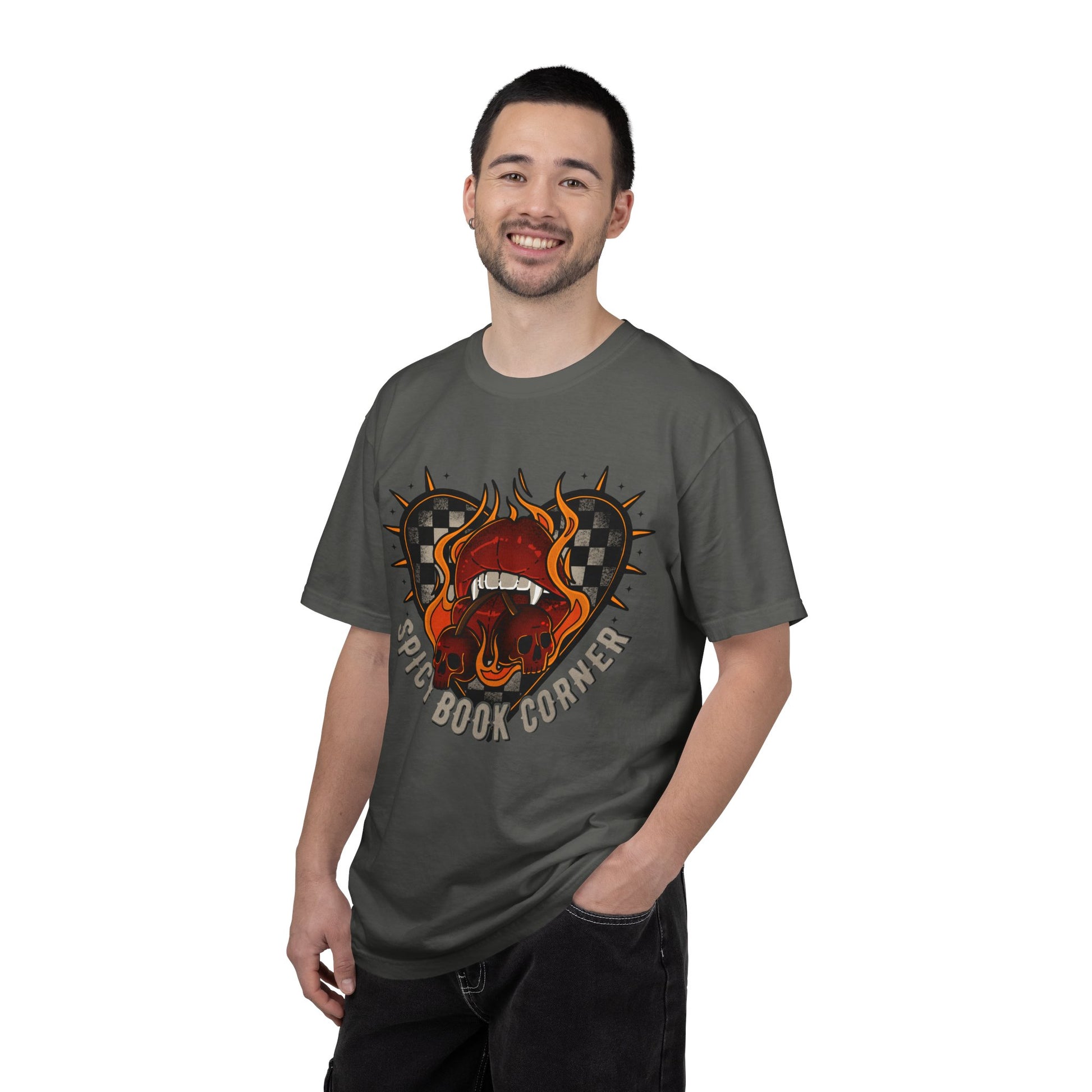 This heavyweight garment-dyed tee brings a bold, bookish attitude to your everyday rotation. The soft, lived-in color and relaxed cut make it feel like an old favorite from the first wear. The front graphic — a flaming mouth, checkerboard heart and skull motif with “Spicy Book Corner” — speaks to readers who love dark humor, cult fiction, and late-night reading sessions. Wear it to author readings, bookstore hangs, or when you’re curled up with a novel and a strong cup of coffee. The sturdy construction and pre-shrunk ring-spun cotton mean it stands up to repeat wear and washings, while the garment-dye finish gives each shirt subtle depth and a vintage vibe.